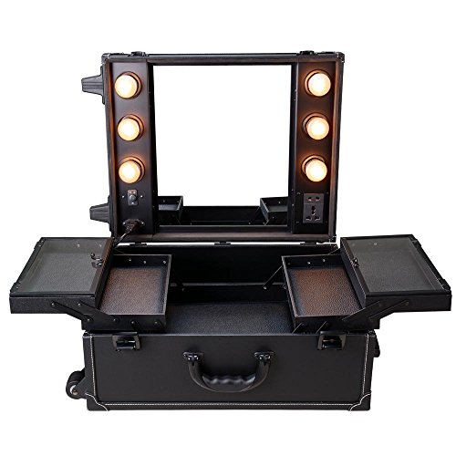 Features: - A portable makeup station with light mirror, perfect for studio and artist making up - Six 40-watts warm light bulbs with dimmer control - Auxiliary power oulets on the top cover for hair dryer using - Four padded trayed, one bottom part, two side compartments and one rear compartment for organization of all your makeup things - Two trays covered with waterproof/dustproof thin layer of film - Lock and key system for security - Inline skate wheels for easy mobility and settling - Heat resistant material keeps the case cool and protects your cosmetics - High quality medium density fiberboard finish - 110-250 volts circuit Specification: - Compact dimensions(LxWxH): 15 3/4"x8 1/2"x19 3/4"(40x22x50cm) - Top cover mirror(LxW): 11 1/2"x14"(29x35cm) - Center tray - bottom part(LxWxH): 11 1/2"x10"x1 1/2"(29x25x4cm) - Center tray - four padded trays(LxWxH): 10"x5 1/2"x1 1/8"(25x14x3cm) - Side compartments(LxWxH): 15"x3 1/4"x3 1/2"(38x9.5x9cm) - Rear compartment(LxWxH): 11 1/2"x3 5/8"x3 1/2"(29x9x9cm) Package Content: - 1x Makeup case - 6x Warm light bulbs - 1x Power cord
