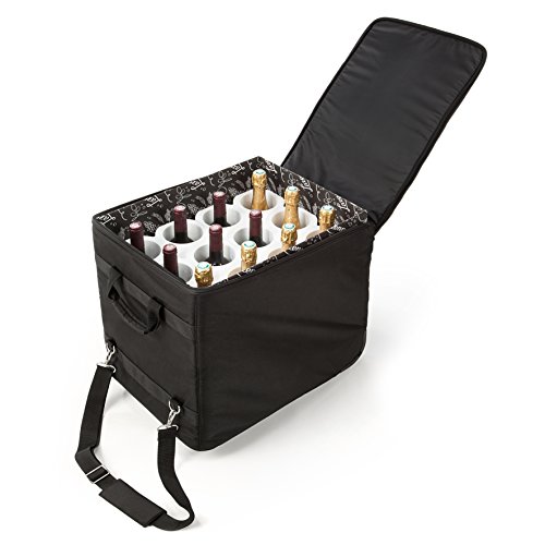 The Wine Check luggage Black + Lazenne Bottles Protector for 12 Larger Bottles + TSA approved Padlock includes: The Wine Check luggage + Lazenne Bottle Protectors for 12 bottles (cardboard box 470 x 355 x 380 mm / 18.5 x 14.0 x 15.0" + Polystyrene inserts for 12 large bottles up to 90 mm / 3.5 in in diameter & up to 340 mm / 13.4 in in height - Typical Burgundy/Pinot Noir or Champagne/Sparkling Wine bottles) Other Info: Durable, high quality Cordura nylon Reinforced stitching Padded sides, top, and bottom Full zippered top for easy access Carrying handles and pull strap with wheels Bottle Insert is 100% recyclable, and made from Expanded polystyrene (EPS), which uses little energy to manufacture and creates little pollution. Dimensions: 19.9"L x 15.6"W x 16"H; weight: 2.6 kg / 5.7 lbs (without wine). A great gifts for wine, beer, and sports lovers!